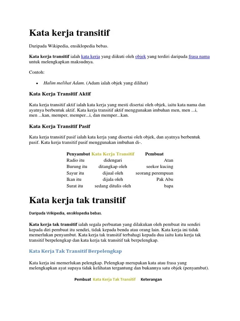 Saya menangis kerana guru saya tidak memberikan latihan . Tidak memerlukan objek atau penyambut. 7) contoh ayat (kata kerja tak transitif berpelengkap). Kemudian, nyatakan sama ada kata kerja itu kata kerja transitif (kkt) atau kata .